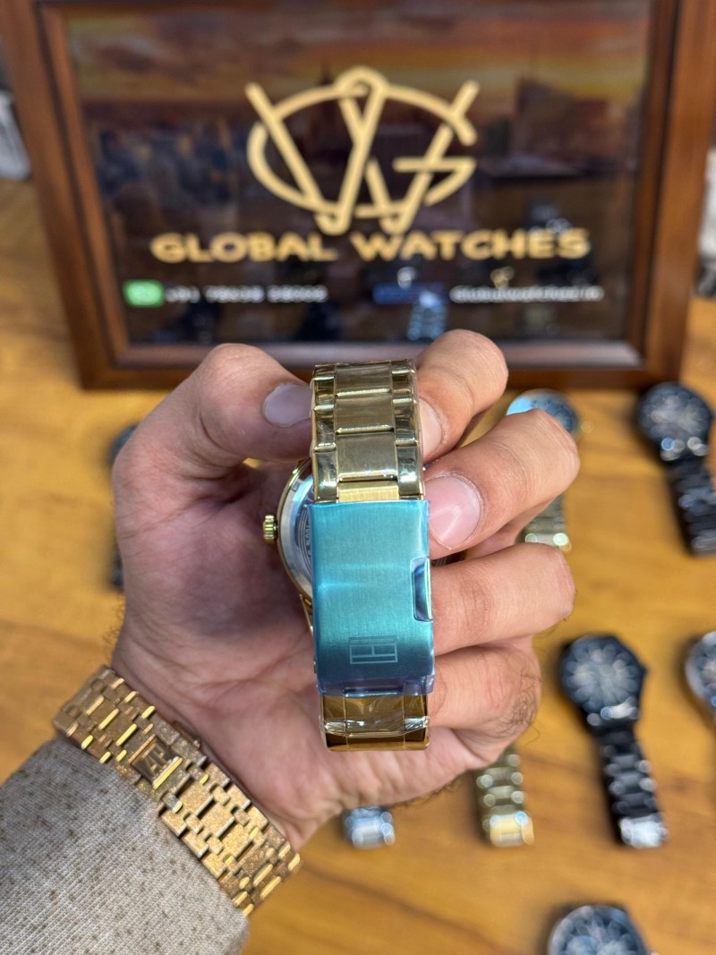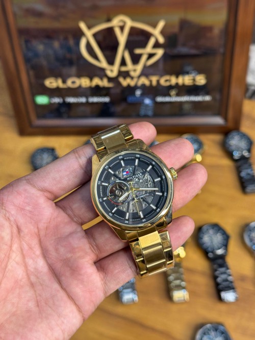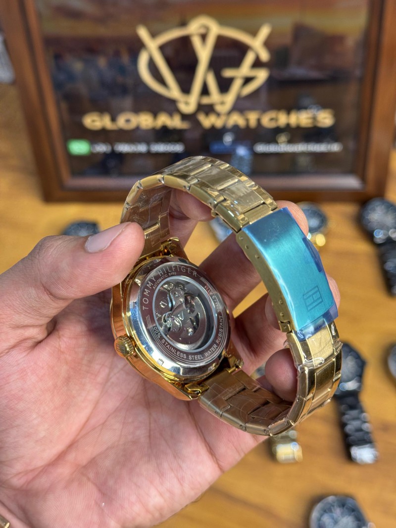 Brand: Tommy Hilfiger. Type: Men's Automatic Watch. Movement: Automatic, meaning it's powered by the motion of the wearer, eliminating the need for a battery. Case & Strap Material: Stainless steel. Dial: Gold/Black, with a partially exposed mechanical movement (skeleton dial). Features: Transparent front and back (exhibition case back), allowing visibility of the automatic movement. Clasp Type: Often features a push-button clasp. Warranty: 6 months of Machinery Warranty